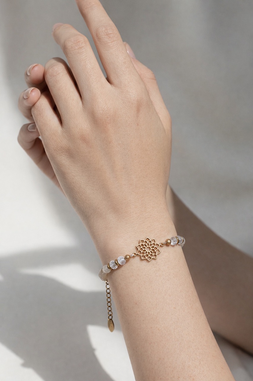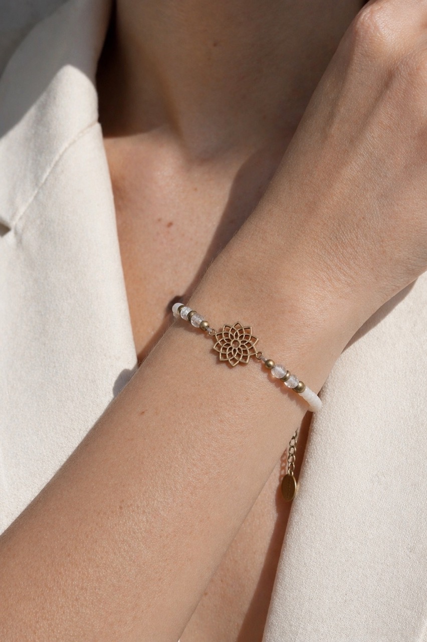 In sanftem Weiss gehalten und mit zarten Messingperlen ergänzt, wird es durch den Bergkristall zu einem besonderen Begleiter im Alltag.