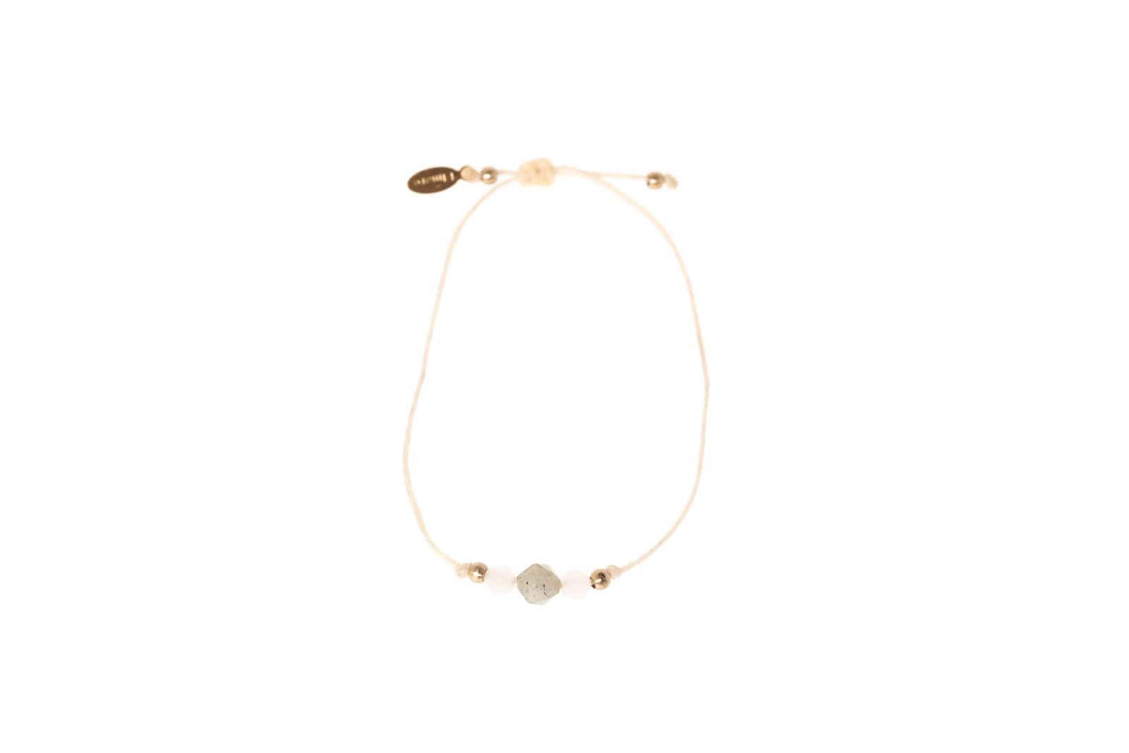 Der Labradorit befindet sich in der Mitte des Armbands. Er beflügelt durch seine Farbenvielfalt die Fantasie, steigert die Kreativität und verbessert das Erinnerungsvermögen. Er lässt uns gut träumen. Neben dem Labradorit befinden sich links und rechts zwei Rosenquarze.