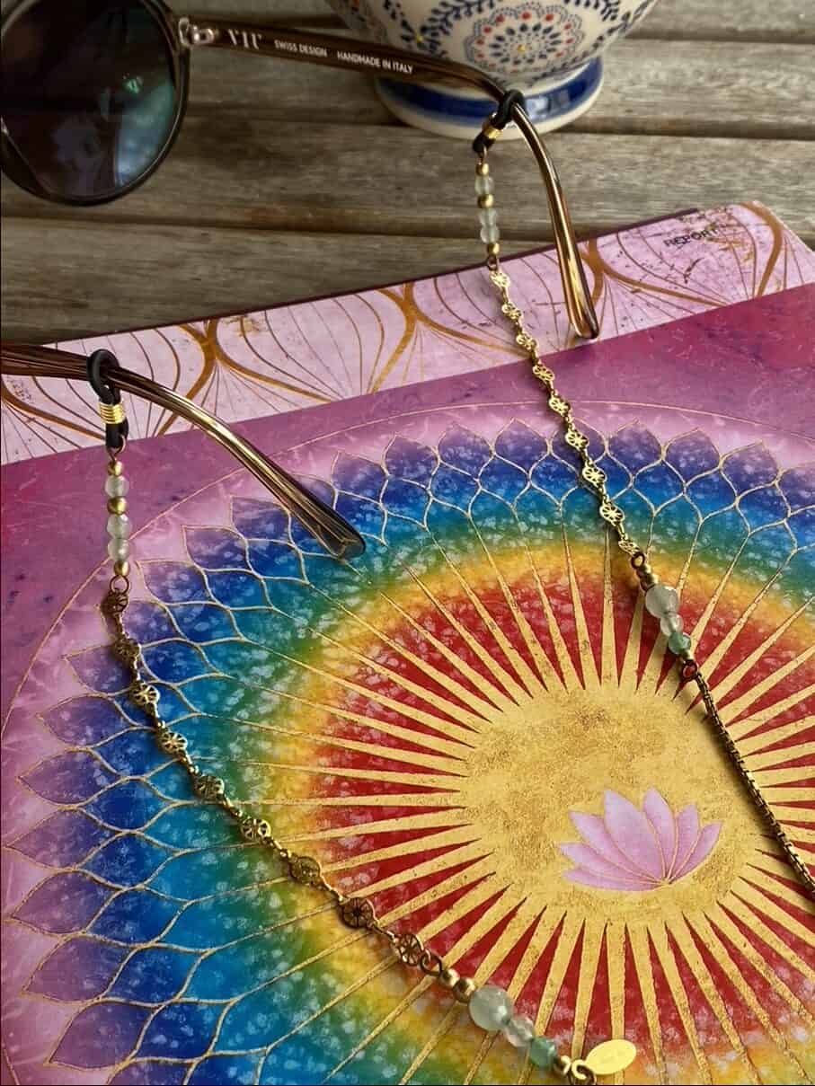 Diese Brillenkette ist aus verschiedenen Messingketten zusammengesetzt und mit den Halbedelsteinen Aventurin bestückt.
