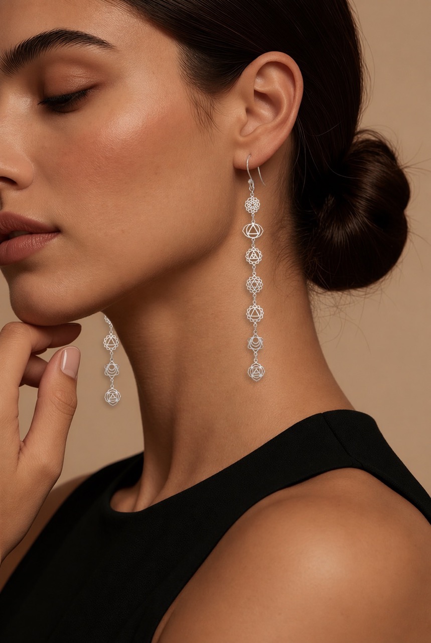 Die Chakra Symbol Ohrringe Silber sind ideal für Frauen, die Wert auf bewusstes Design und feine Symbolik legen. Die sieben Chakrasymbole verlaufen harmonisch entlang der Ohrringe und schwingen sanft bei jeder Bewegung mit – ein zartes Statement für Achtsamkeit, innere Stärke und Energieausgleich.