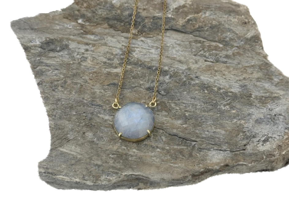 Zur Auswahl stehen zwei faszinierende Natursteine: der schimmernde Mondstein mit seinem sanften, mystischen Glow oder der ausdrucksstarke Labradorit mit charakteristischem Farbspiel in Grau-Blau-Nuancen. Beide Steine besitzen einen Durchmesser von 2 cm und entfalten durch ihren Facettenschliff ein lebendiges Lichtspiel. Gefasst sind sie in hochwertigem Messing, dessen warme Farbe die natürliche Eleganz der Steine sanft hervorhebt. Die Länge der Kette ist zwischen 40 und 48 cm und passt zu unterschiedlichen Looks und Ausschnitten.