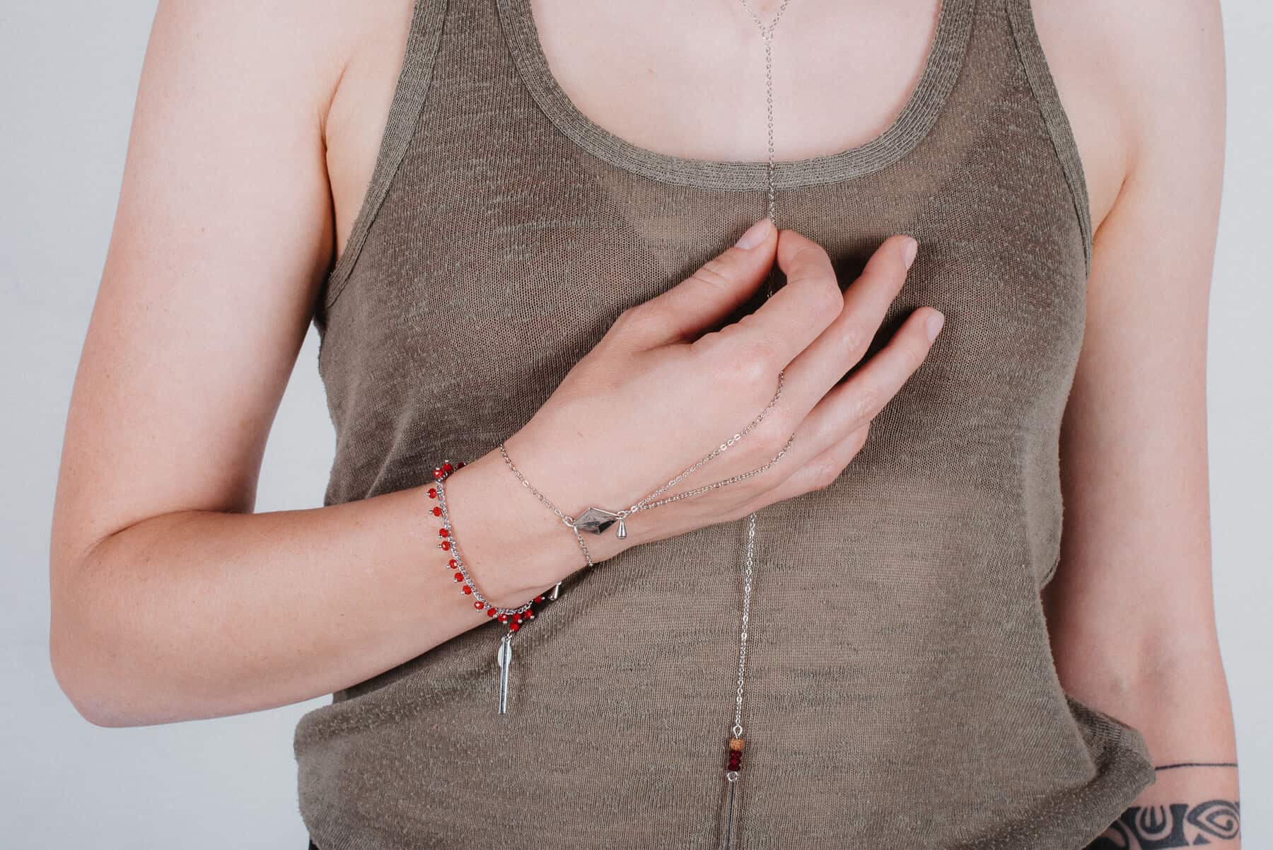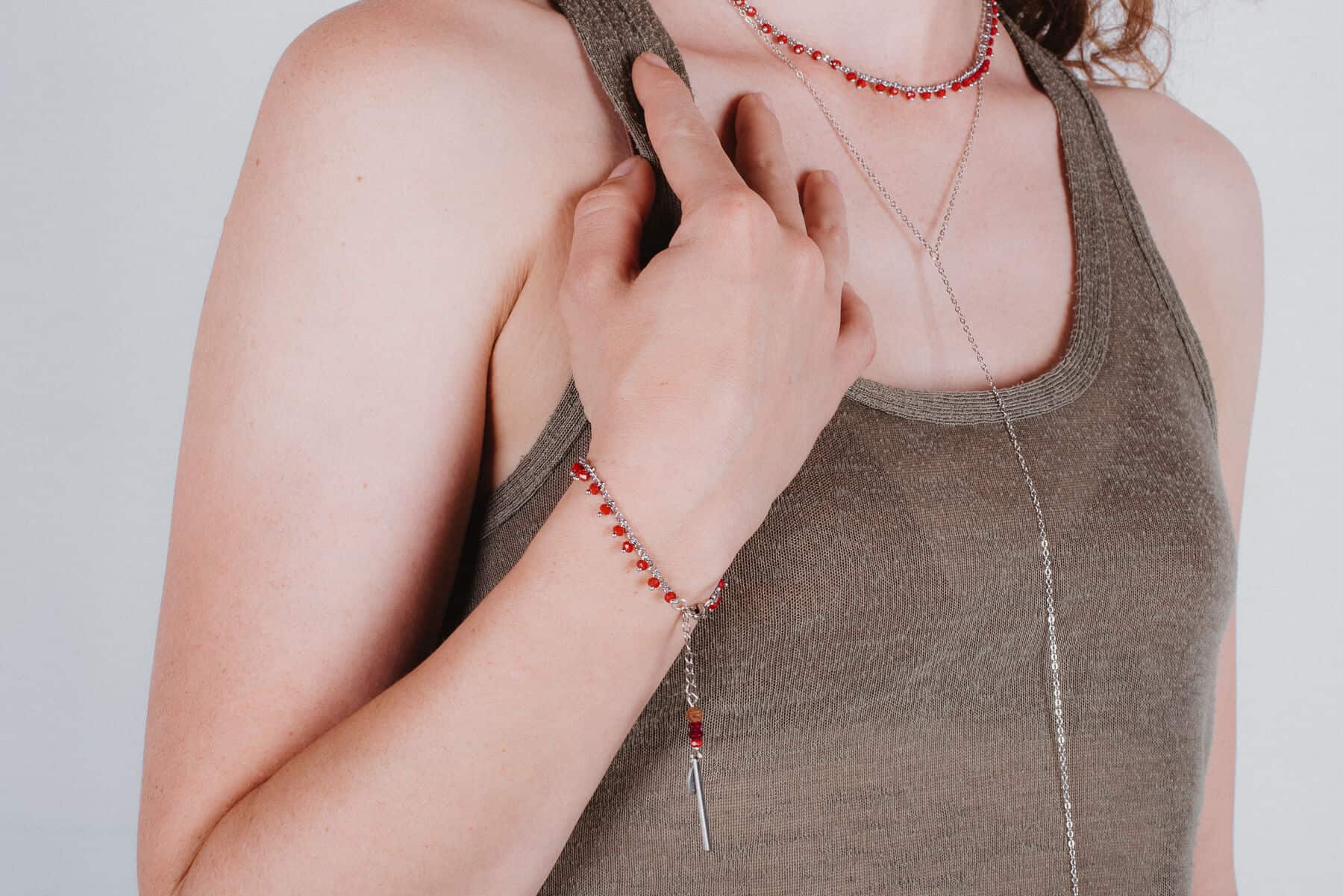 Die kurze Kette ist mit feinen, roten Perlen verziert und verleiht dem Design eine verspielte, farbenfrohe Note.