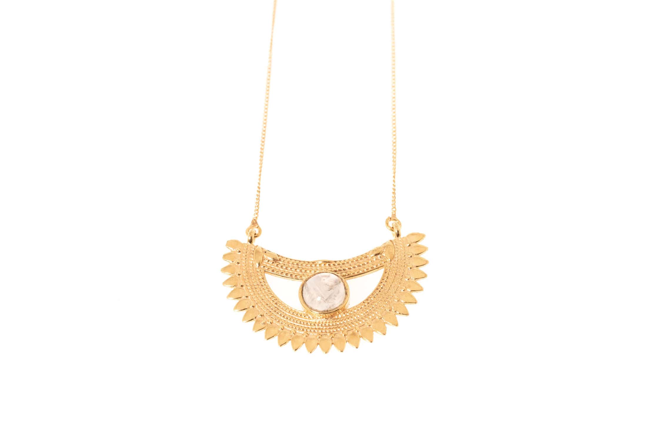 Diese Kette, welche aus Messing 24K vergoldet, angefertigt wurde, besticht durch ihr besonderes Design. Die filigrane Form der Kette mit einem einzigartigen Anhänger, in halbrunder Form mit kleinen Verzierungen und wunderschönem Muster mit einem Halbedelstein mittig platziert. Diese Kette aus Messing 24K vergoldet gibt es in zwei Varianten. Einmal mit einem Labradorit und einmal mit einem Mondstein.