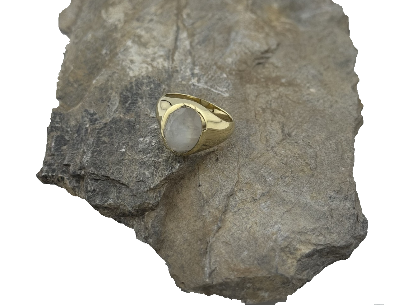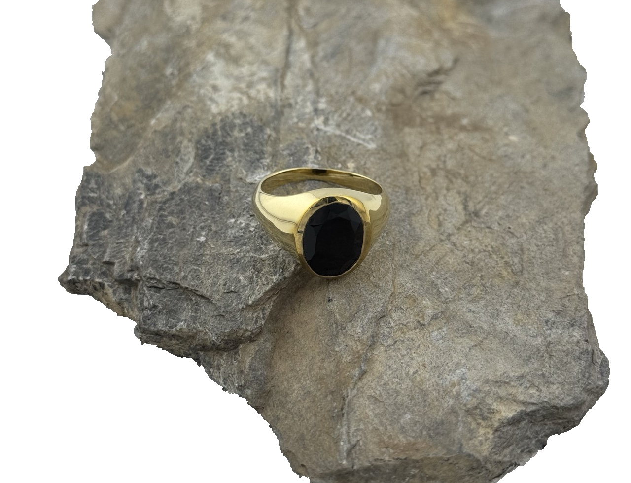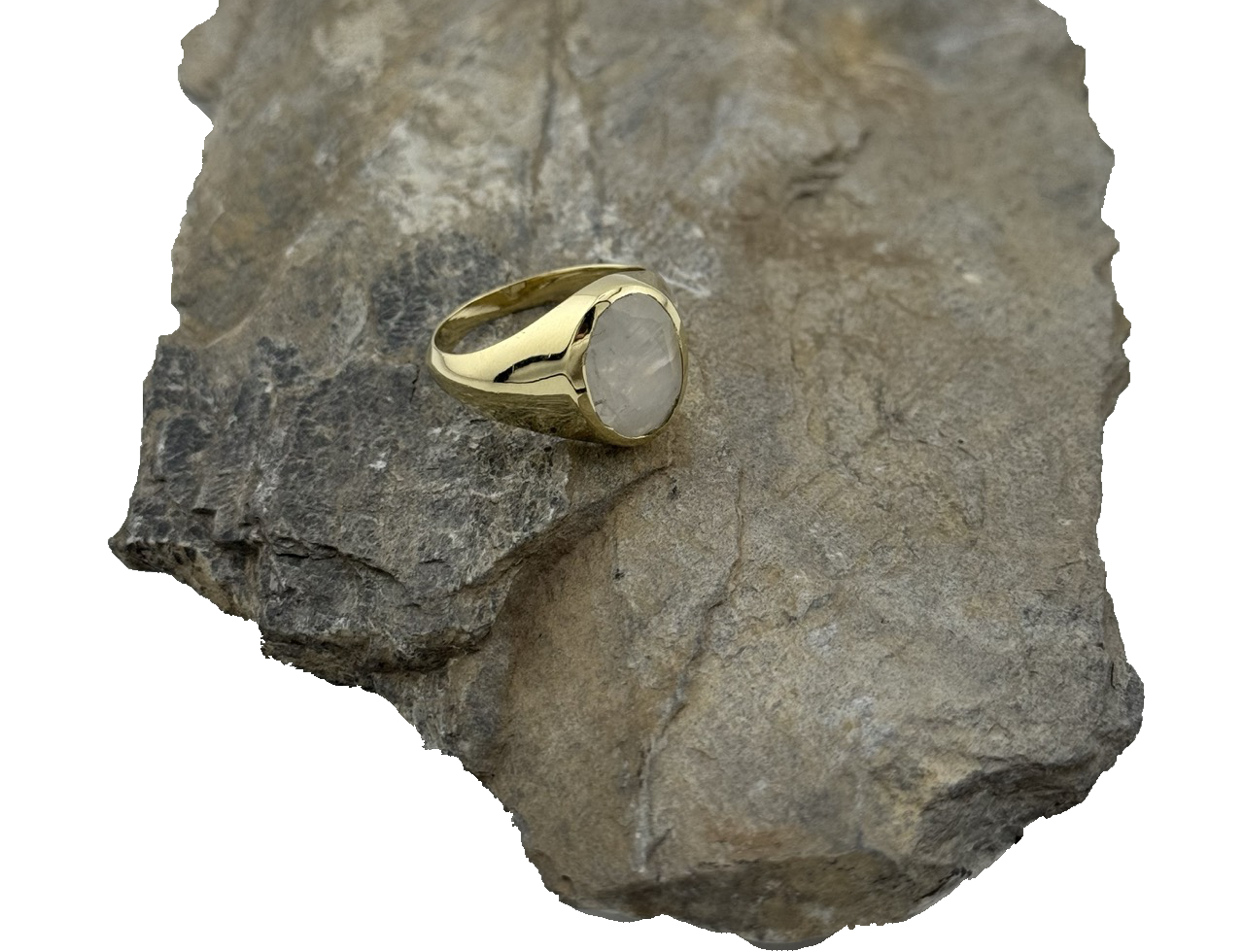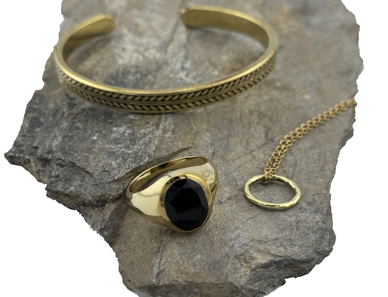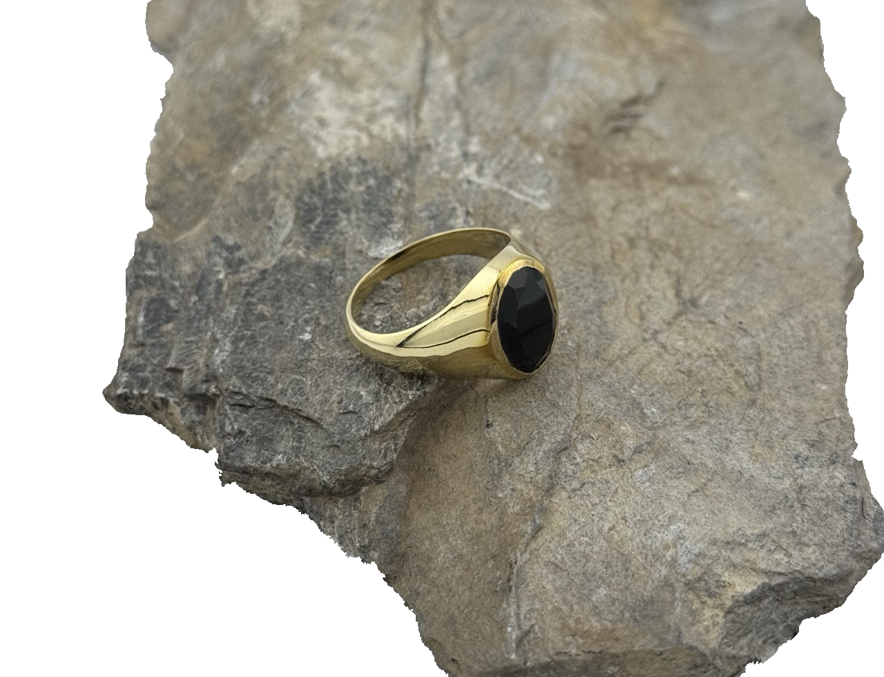 „Golden Lunaris“ lässt sich vielseitig kombinieren – ob zur Jeans, zum Hemd oder zum Leinenhemd im Sommer. Der goldene Ton betont jeden Hauttyp und passt zu hellen wie dunklen Farben. Onyx bringt Tiefe und Kraft, während der Mondstein Ruhe und Licht schenkt. Dadurch wird der Ring zum zentralen Statement jedes Outfits – schlicht und doch bedeutungsvoll.
