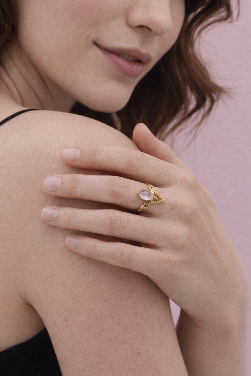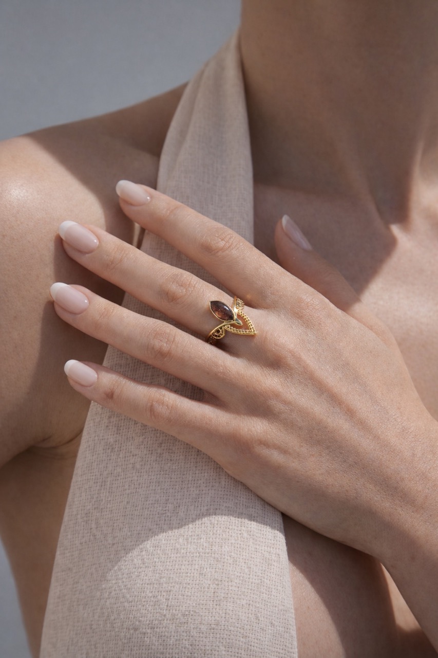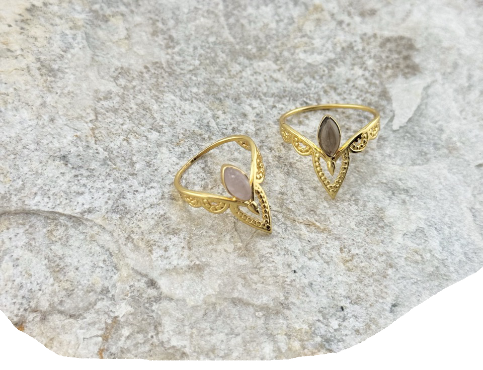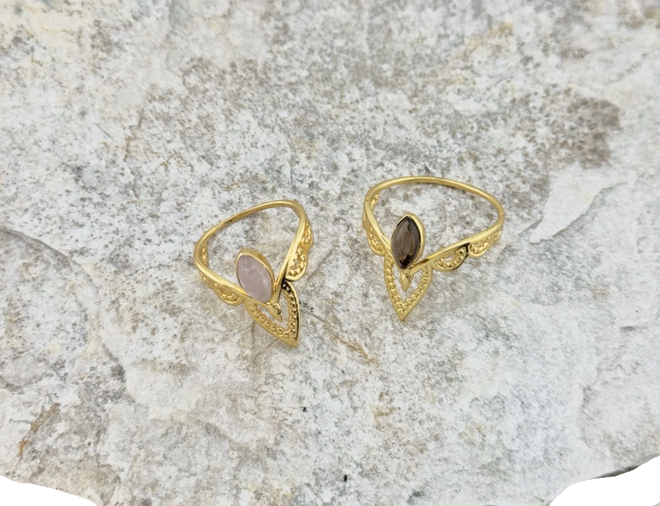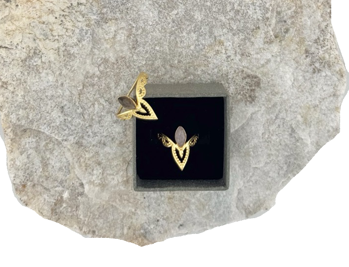 Der Sacred Petal Ring vereint feine Goldverzierungen mit der Energie deines gewählten Edelsteins: dem sanften Rosenquarz oder dem schützenden Rauchquarz. Die Form erinnert an ein Blütenblatt oder ein heiliges Auge – ein Design, das Weiblichkeit, Erdung und Intuition in sich trägt.