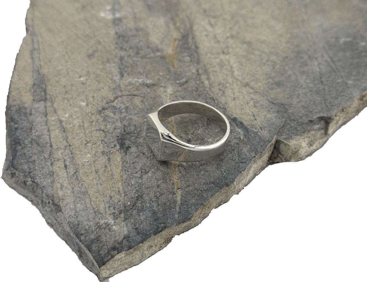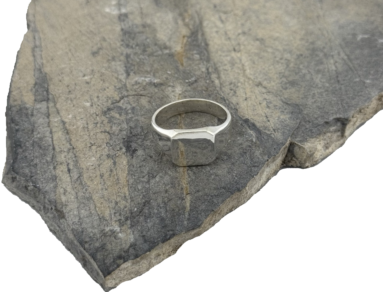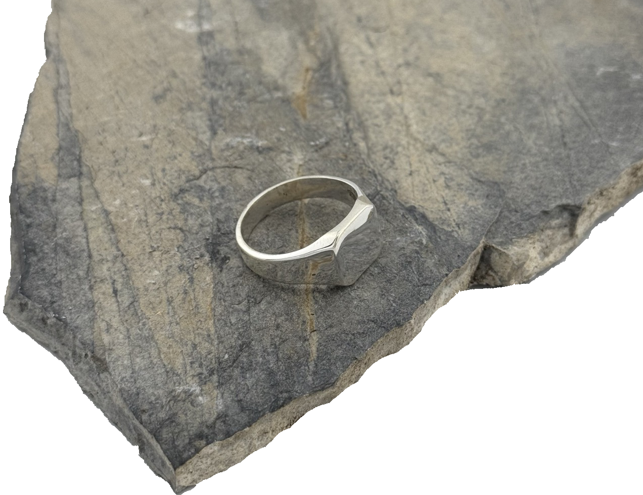 Jeder Ring wird in sorgfältiger Handarbeit aus echtem 925 Sterling Silber gefertigt. Die glänzende Oberfläche verleiht ihm eine moderne, urbane Note, während die klare Form eine ruhige Stärke ausstrahlt. Das kantige Design ist inspiriert von natürlichen Felsstrukturen und unterstreicht die Individualität seines Trägers – kein Ring gleicht exakt dem anderen.